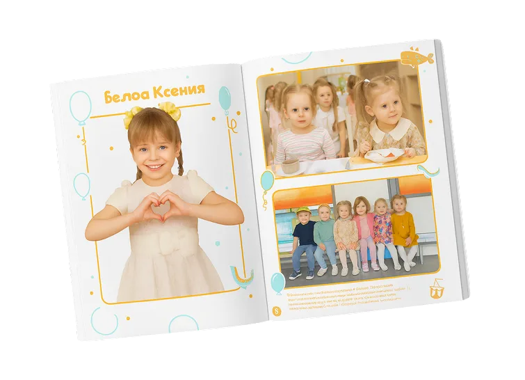 Вы можете выбрать один из 13 вариантов оформления альбома. Среди них — макеты «Рисунки», «Пиксель», «Африка», «Игрушки» и другие дизайны. Каждый шаблон включает индивидуальное портретное фото, групповые снимки всех выпускников, репортажные кадры с мероприятий и портреты воспитателей.