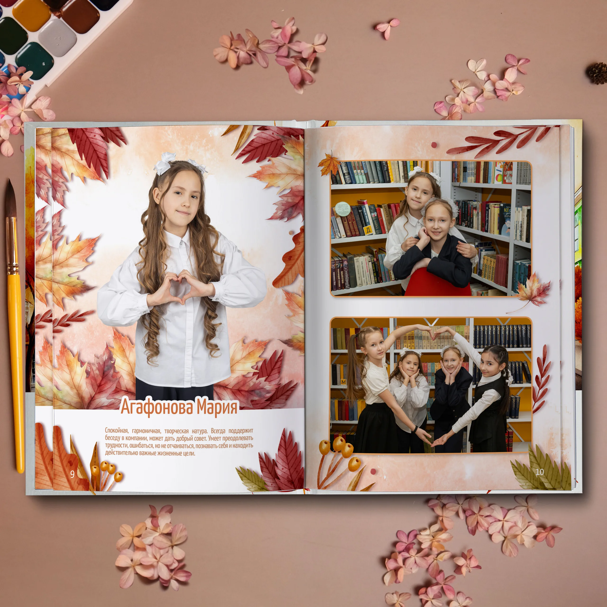 3ий разворот и далее — личные страницы учеников (портретная фотография, информация об ученике и 2 фотографии личного репортажа)